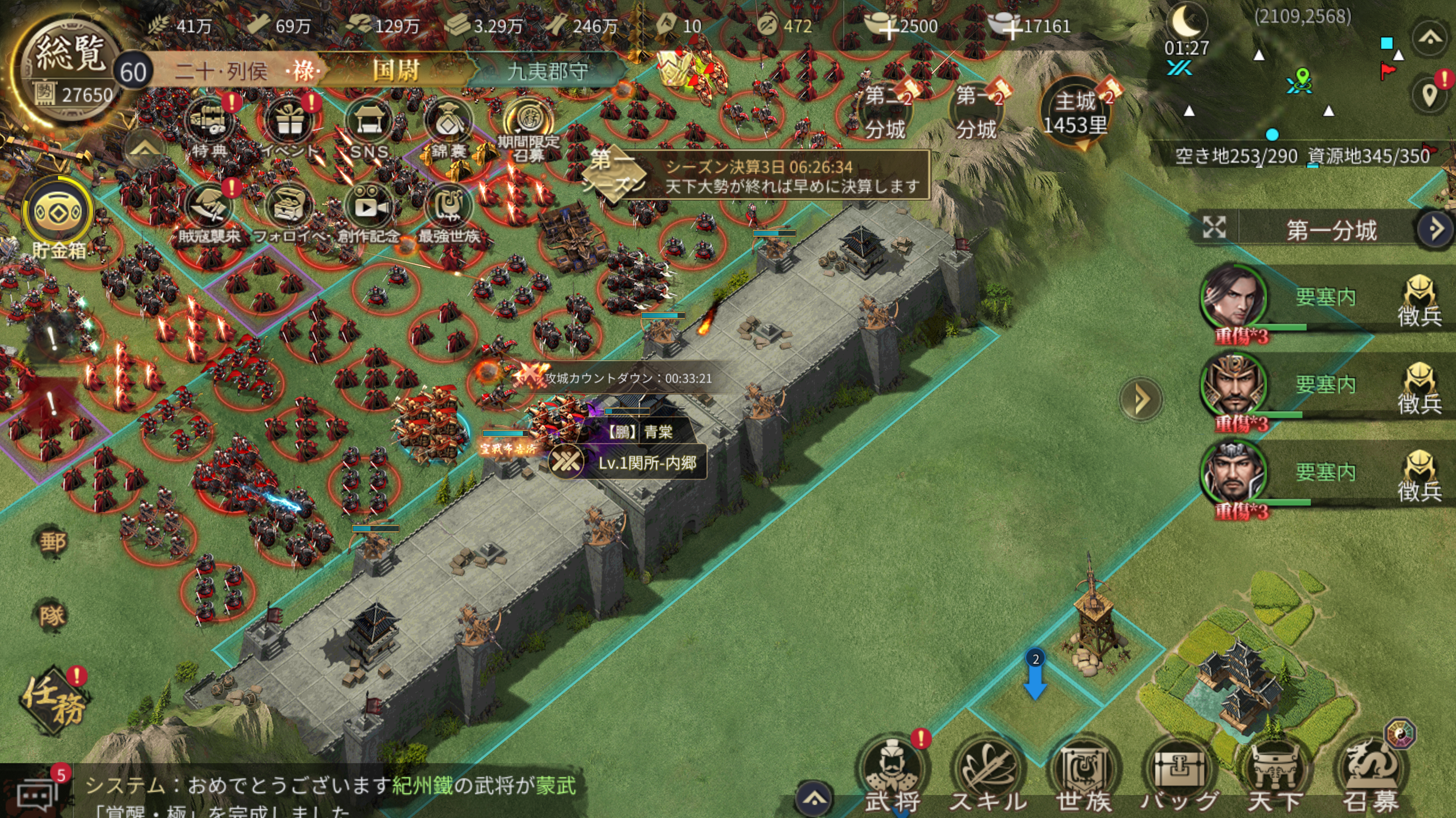 ここでは、西側に建設していた関所を、相手の同盟軍に攻められていることが心情的にも受け身にさせられました。「もう上庸はあきらめないといけないかな」、こんなネガティブな思考が、どんどんと受け身な姿勢となっていった気がします。